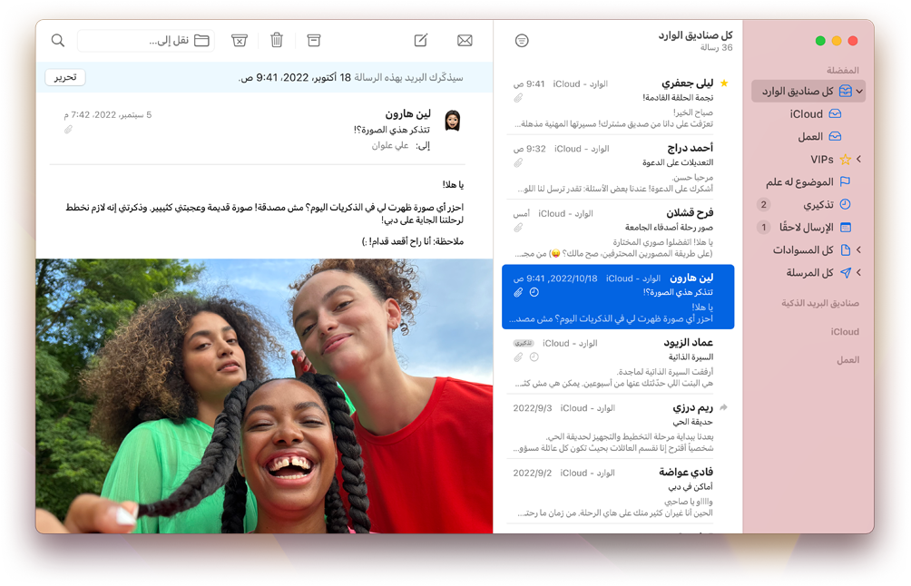 بريد iCloud مدمج بتناغم تام في تطبيق البريد على أجهزة iPhone وiPad وMac وعلى iCloud.com، ما يسهّل إرسال الإيميل واستلامه من أي مكان. كما تم دمج ميزات أمان مثل الحماية من الإيميلات المزعجة والتصيّد الاحتيالي لاكتشاف الإيميلات غير المهمة وحظرها قبل أن تصل إلى صندوق بريدك الوارد. من السهل إعداد عنوان إيميلك icloud.com@، وعند الاشتراك في +iCloud، ستتمكن من تخصيص عنوان إيميلك عبر إنشاء نطاق بريد إلكتروني مخصص.