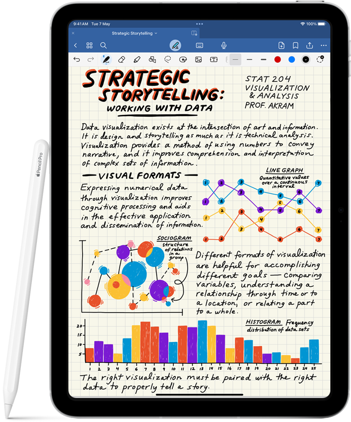 Image of Apple Pencil Pro and Apple Pencil USB-C next to multiple iPad devices displaying examples of handwritten notes and colorful illustrations created with Apple Pencil.