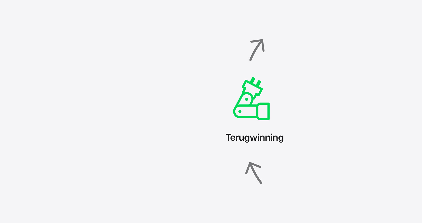 Terugwinning. Met de hulp van recyclagebedrijven zorgen we ervoor dat we producten kunnen hergebruiken. En bedenken we nieuwe oplossingen om zoveel mogelijk duurzame materialen terug te winnen. We delen onze kennis ook met de branche om samen stappen vooruit te zetten.