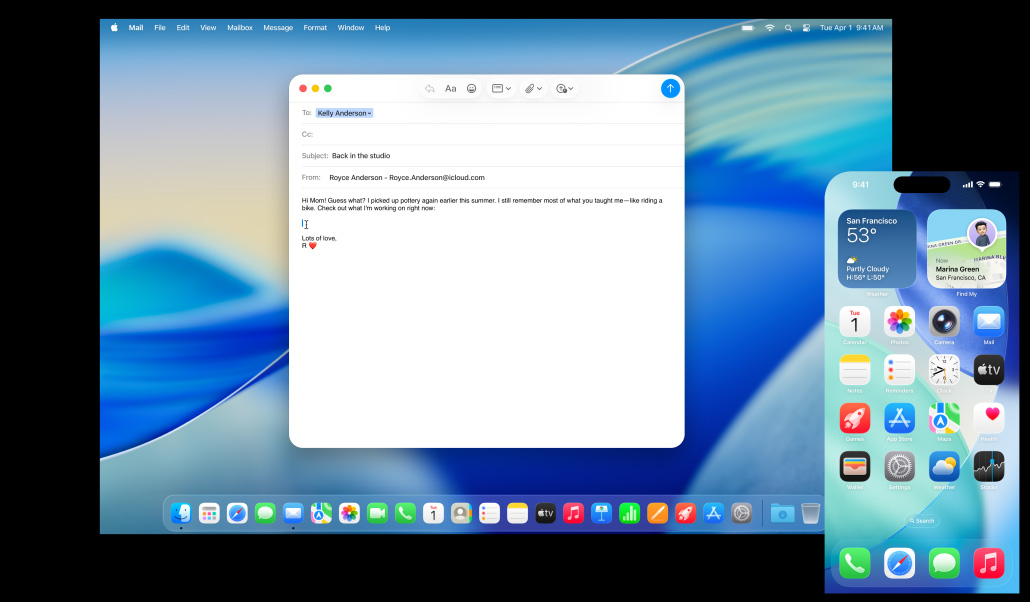 El Mac, el iPhone, el iPad y el Apple Watch ya son increíbles por su cuenta. Pero al usarlos juntos, se lucen mucho más. Gracias a Continuidad, tus dispositivos trabajan en equipo con total fluidez para que puedas acceder a un mundo de funcionalidades espectaculares. Empieza a escribir un email en tu Mac y termínalo en el iPad. Saca una foto en tu iPhone para verla al instante en el Mac. O haz llamadas sin tener que usar el iPhone.1 Todo gracias a Continuidad.