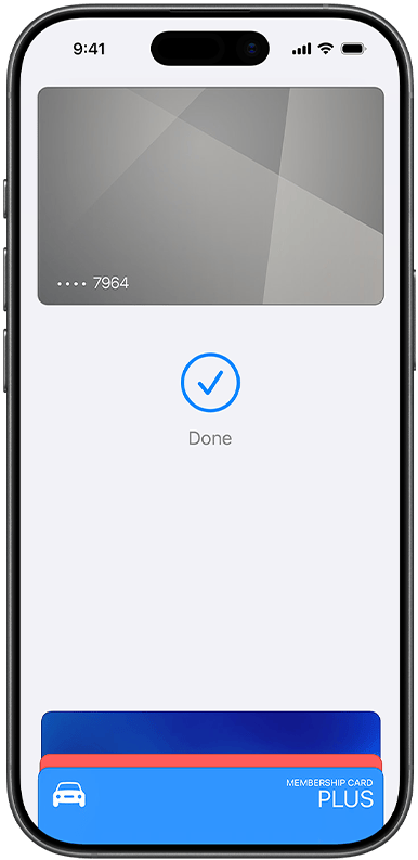 • Kreditní nebo debetní kartu přidáš jednoduše tak, že otevřeš aplikaci Peněženka, klepneš na plus a přiložíš vyhovující kartu k zadní straně iPhonu.1 Nebo můžeš kartu přidat ručně – otevři aplikaci Peněženka, klepni na plus a postupuj podle pokynů na obrazovce. Zadané údaje budeš muset ověřit u své banky nebo vydavatele karty. Pokud máš spárované Apple Watch, rovnou dostaneš možnost přidat kartu i do hodinek. A když si pořídíš nový iPhone, svoje karty do něj přeneseš jedním snadným krokem.