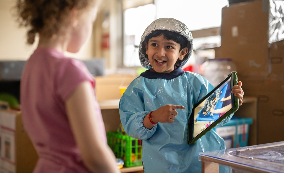 Students draw self-portraits on iPad every month, illustrating their development and the evolution of how they perceive and represent themselves. Using GarageBand, young learners discover how different instruments, notes, and chords can communicate feelings. And each week, a student is assigned the role of “class photographer.” They use iPad to capture moments and photos of things they find interesting around the school, and then share them with the class using AirPlay on the classroom Apple TV.