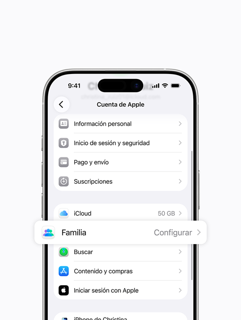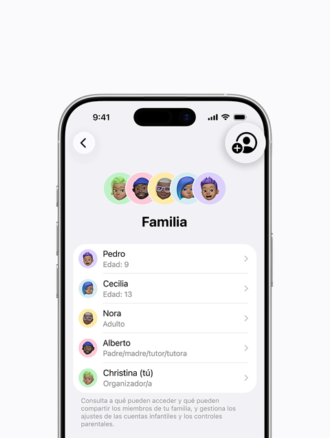 • Si tus hijos utilizan tu Cuenta de Apple, tendrán acceso a tu contenido personal, como los mensajes y las fotos. Además, no podrás usar todas las prestaciones para familias.