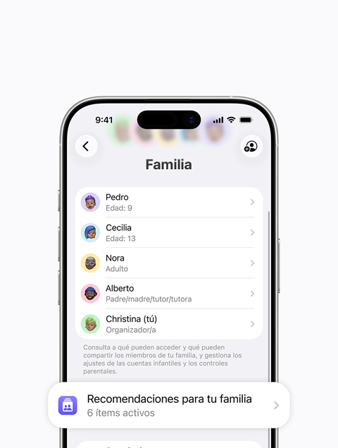 • Obtén consejos y sugerencias para sacar el máximo partido a las prestaciones para familias. Abre Ajustes y toca tu nombre, seguido de Familia, y elige Recomendaciones para tu familia.