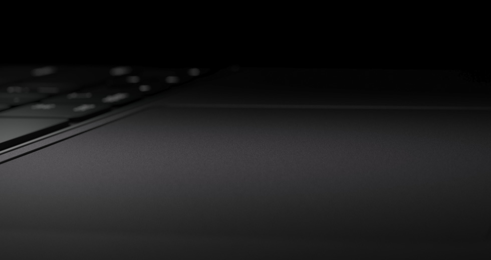 iPad Pro, landscape orientation, space black color, top edge profile, attached to Magic Keyboard, front exterior, landscape orientation, black color backlit keys, dedicated function key row, escape, tab, caps lock, shift, control, option, shift, delete, return, inverted-T arrow keys, built-in trackpad
