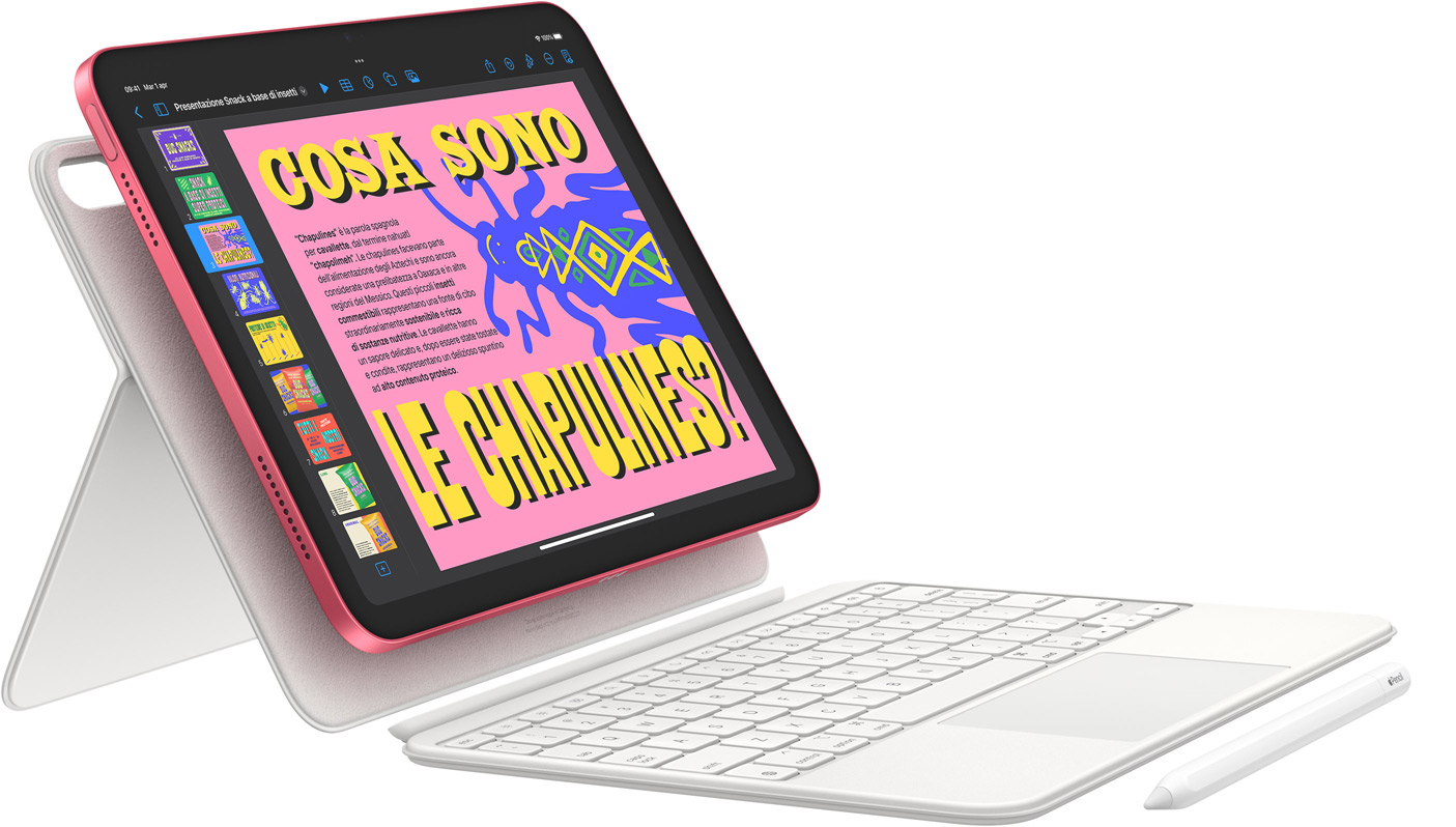 Ti va di fare un disegno o addirittura un dipinto? O vuoi semplicemente scrivere? Apple Pencil è lo strumento ideale. Con la Magic Keyboard Folio, invece, puoi comodamente digitare, usare il trackpad e inclinare l’iPad per avere una visione ottimale.2 Ha un design versatile in due pezzi, tutti i tasti che ti servono per le scorciatoie che già conosci, e un ampio trackpad interamente cliccabile. Bella e geniale, no?