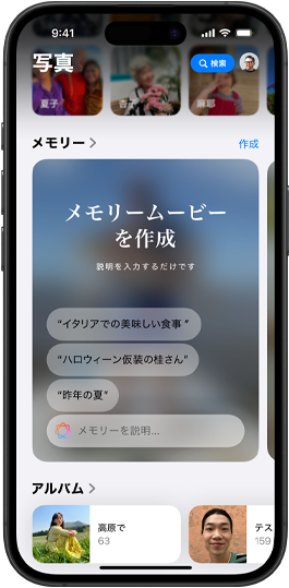 見たいストーリーがあるなら、写真アプリから直接自分だけのメモリームービーを作成しましょう。説明を入力すると、Apple Intelligenceがそれに最適な写真やビデオを選択。さらにテーマを識別してユニークなチャプターを持ったストーリーを構成。オリジナルのムービーに仕上げ