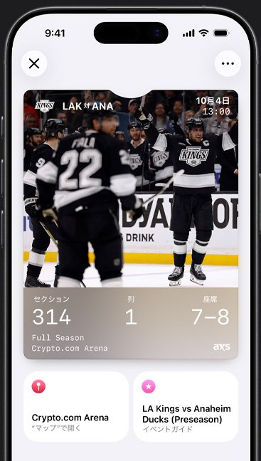 • ウォレットは、様々なカードやパスを簡単に使えるようにします。一部のカードやパスは、時間や場所に合わせて自動的に表示されるので便利です。例えば搭乗券は、あなたが空港に到着するとiPhoneまたはApple Watchの画面に映し出されます。