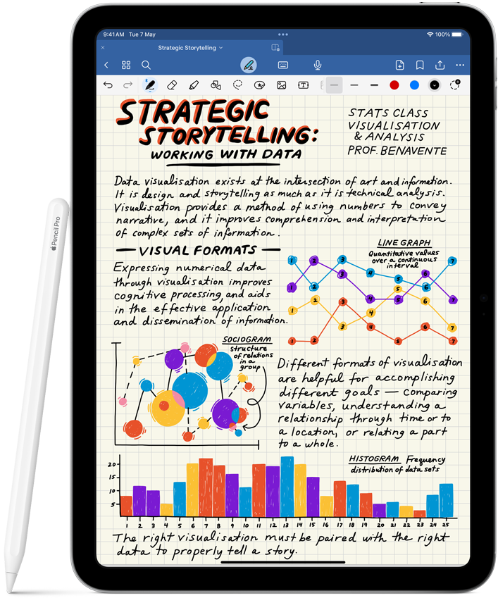 Image of Apple Pencil Pro and Apple Pencil USB-C next to multiple iPad devices displaying examples of handwritten notes and colourful illustrations created with Apple Pencil.
