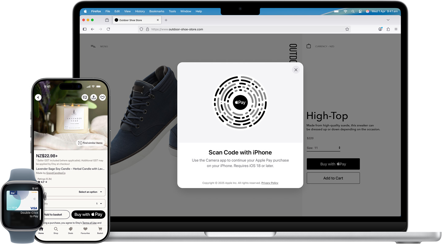 In apps and online. Use Apple Pay to seamlessly make purchases in Safari and other browsers — on iPhone, iPad, Mac and other computers — without the lengthy check-out forms. On an Apple device, click or tap the Apple Pay button and pay with a touch or glance. On a non-Apple device, scan the Apple Pay code with your iPhone camera and use your iPhone to complete your purchase.2 You can even use Apple Pay to subscribe to services like Apple Music and Apple TV, buy apps and games on the App Store, and upgrade your iCloud storage.
