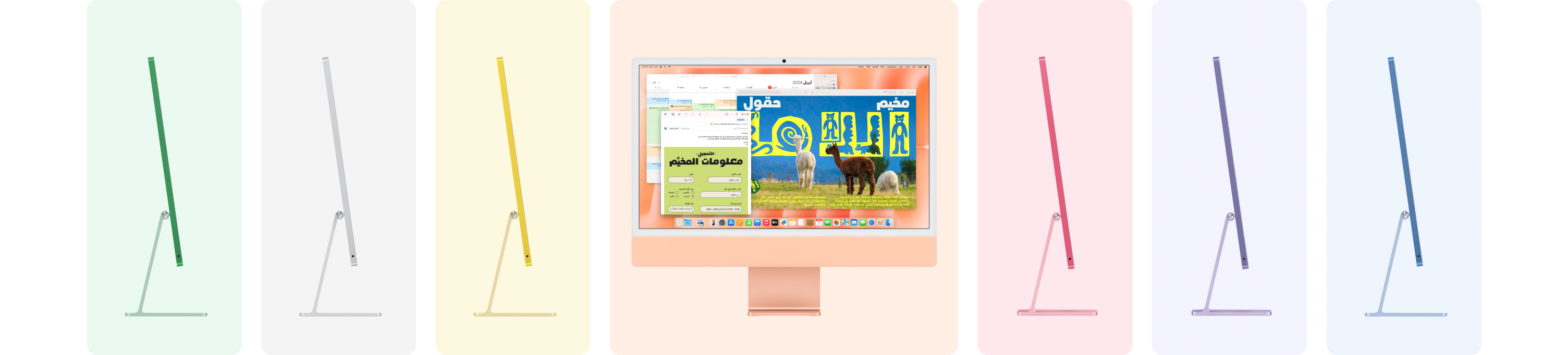 iMac باللون الأزرق iMac باللون الأخضر iMac باللون الوردي iMac باللون الفضي iMac باللون الأصفر iMac باللون البرتقالي iMac باللون الليلكي