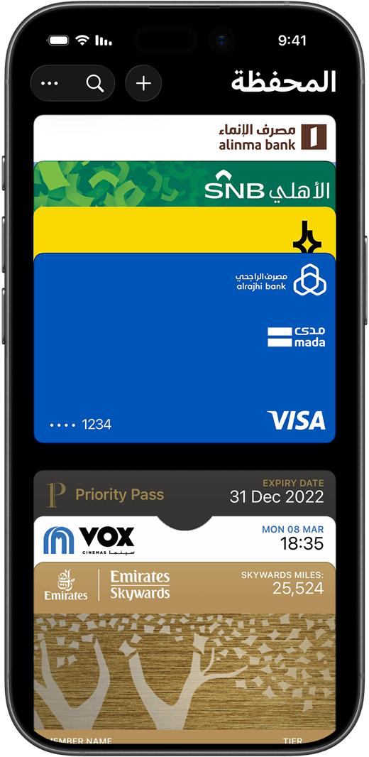 • تطبيق المحفظة من Apple هو تطبيق في iPhone وApple Watch يساعدك على ترتيب بطاقات الائتمان والسحب وبطاقات المواصلات وبطاقات صعود الطائرة والتذاكر وبطاقات المكافآت وغيرها، وحفظها بشكل آمن ومريح في مكان واحد.