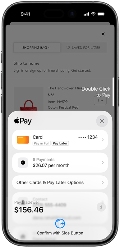 Apple Pay gives you flexibility at checkout when you shop in stores with iPhone, or online and in apps with iPhone or iPad. You can choose to pay in full or split your purchases into smaller payments over time through an eligible card.2